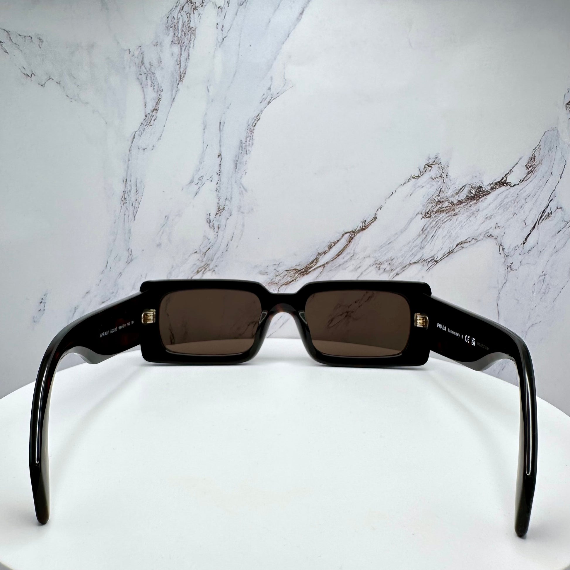 Shop now the iconic Prada brown acetate rectangle sunglasses PR A07S 16N5Y1 featuring the brand's name boldly spelled out in gleaming gold metal. These unisex designer shades perfectly blend timeless style with contemporary edge.